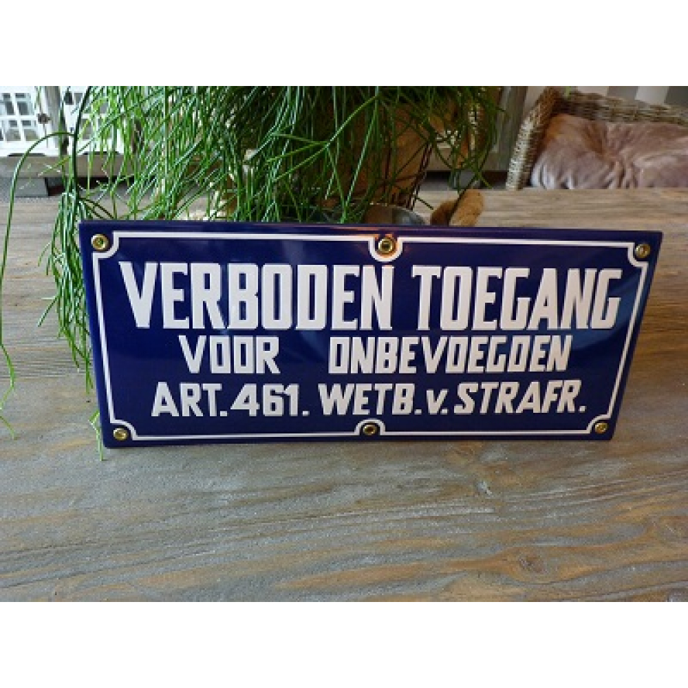 Emaille waarschuwingsbord "Verboden Toegang voor onbevoegden Art. 461 Wetb. v. Strafr.".