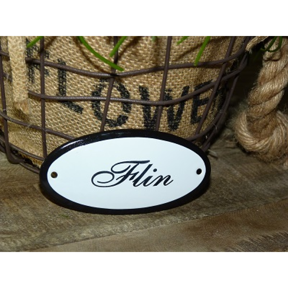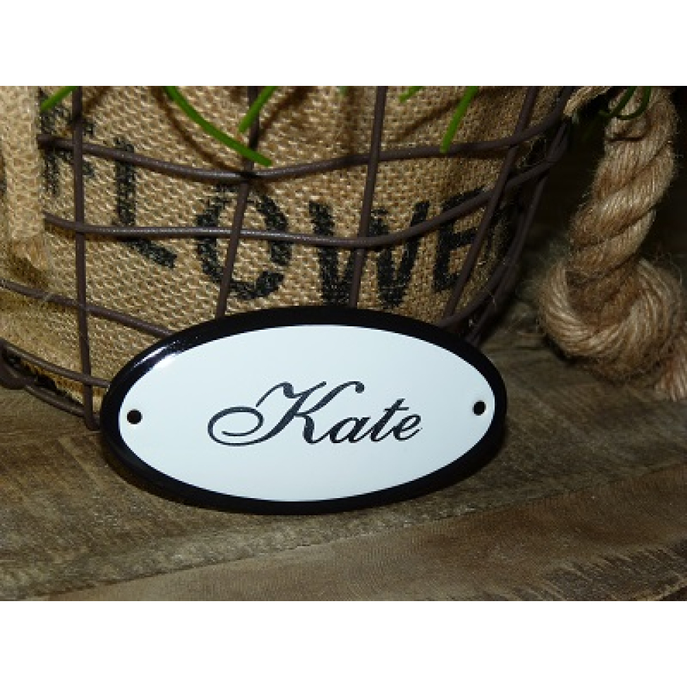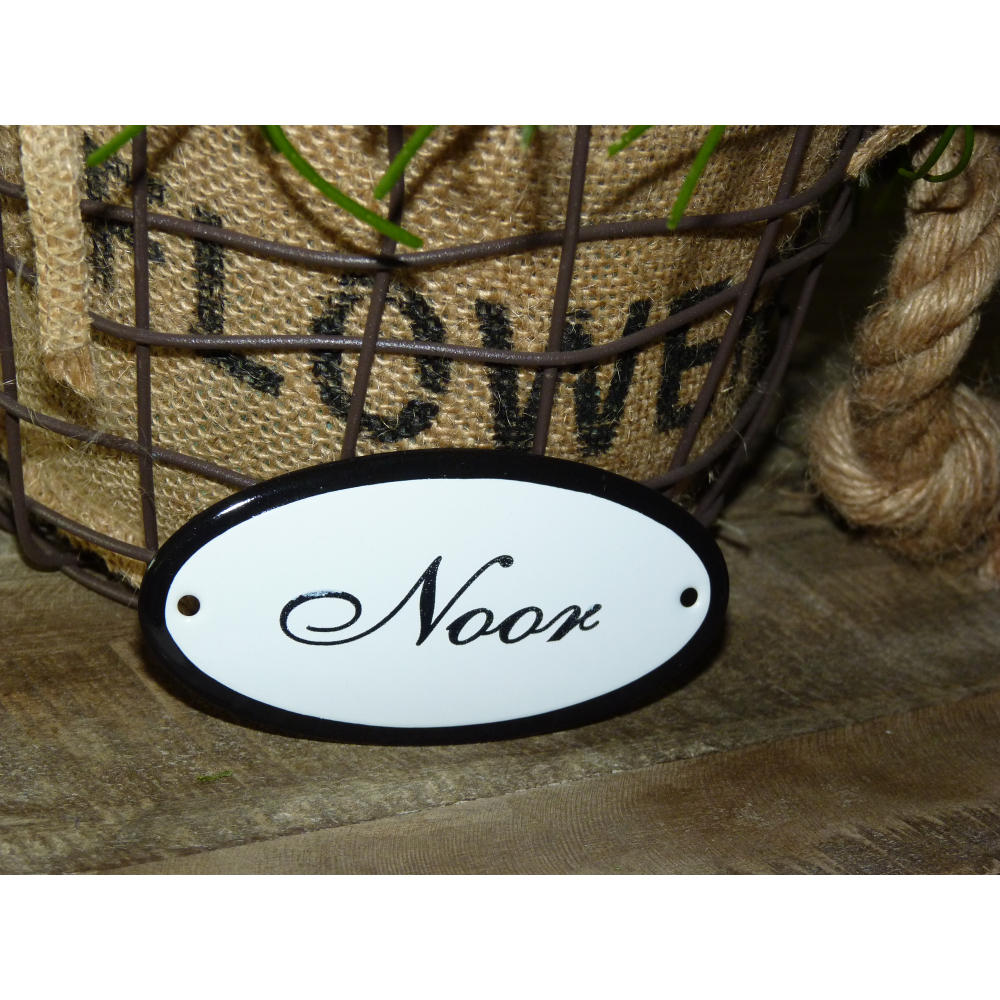 De achtergrond van het bordje is wit met zwarte rand en  sierletters zoals afgebeeld op de productafbeelding.