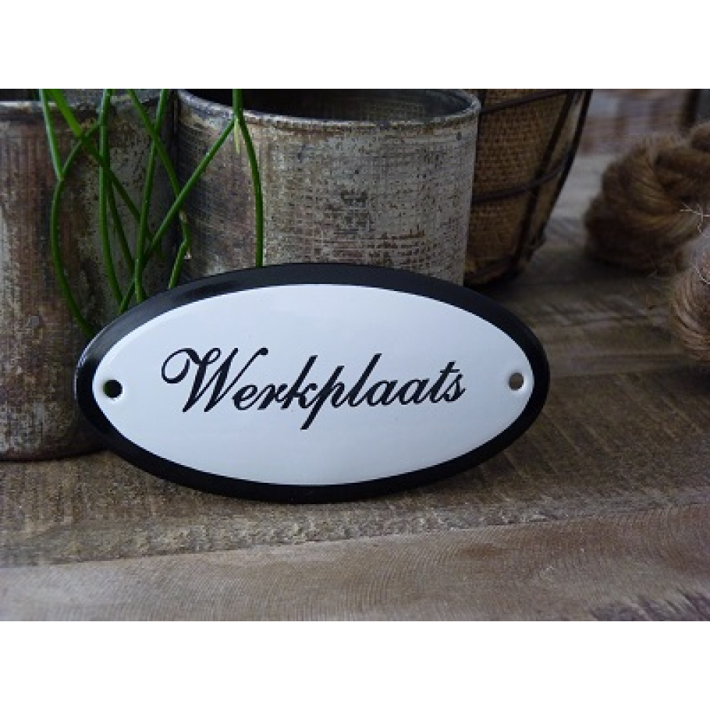 Emaille deurbordje ovaal 'Werkplaats'